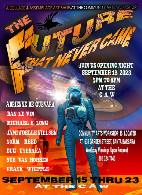 There’s at all times one thing cool occurring at CAW. Indy photographer Carl Perry’s present LUNCH is August 29 (see Josef Woodard’s story right here), and following that could be a group present, The Future That By no means Got here, that includes eight assemblage and collage artists exploring the present’s theme of retrofuturism — a motion within the inventive arts exhibiting the affect of depictions of the long run produced in an earlier period. Artist organizer Sue Van Horsen, impressed by sci-fi reveals like Star Trek, Misplaced in Area, Gigantor and Jonny Quest is bringing collectively a few of Santa Barbara’s coolest collage and assemblage artists for a 10-day present starting September 15 on the Group Arts Workshop Gallery (CAW). Artists embrace: Adrienne De Guevara, Dan Le Vin, Michael Lengthy, Jami Nielsen, Norm Reed, Dug Uyesaka, Frank Whipple, and Sue Van Horsen.