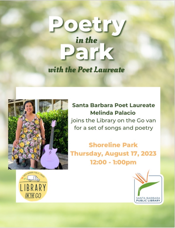Thursday, August 17, midday to 1 p.m., Poetry within the Park, 1237 Shoreline Dr., Santa Barbara. A set of poems and songs by the Poet Laureate.